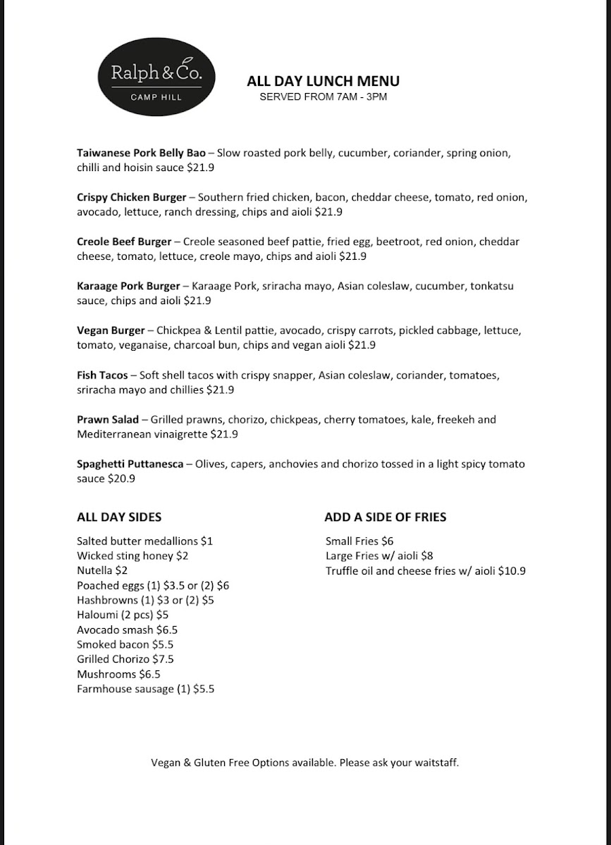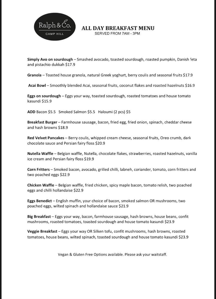 Ralph & Co Camp Hill offers a thoughtfully curated menu that balances simple café favourites with heartier, casual bites. Whether you're stopping by for a relaxed breakfast or a laid-back brunch, you’ll find a range of dishes and drinks designed to suit easy-going, everyday moments.